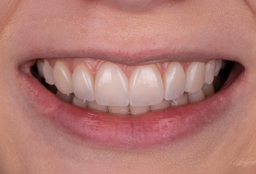 Nasza pacjentka w trakcie leczenia miała wykonaną korektę chirurgiczną uśmiechu dziąsłowego, wybielanie zębów oraz zmianę estetyki uśmiechu za pomocą licówek ceramicznych.