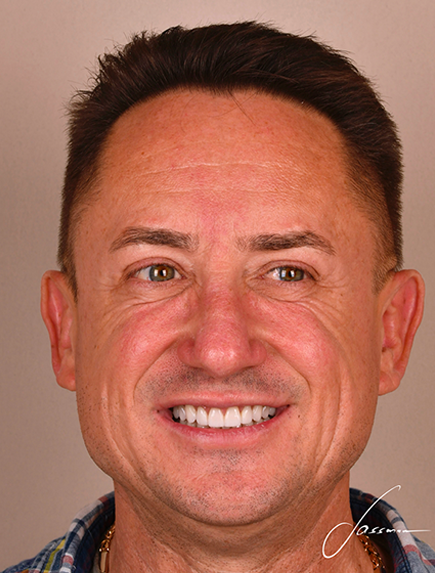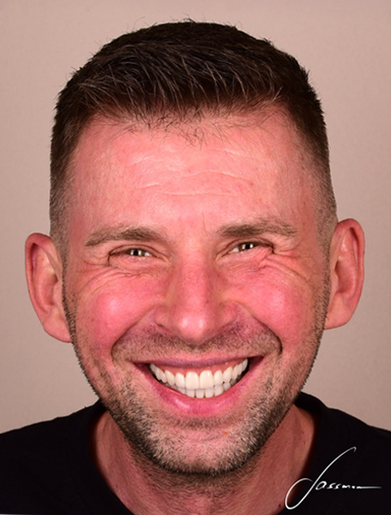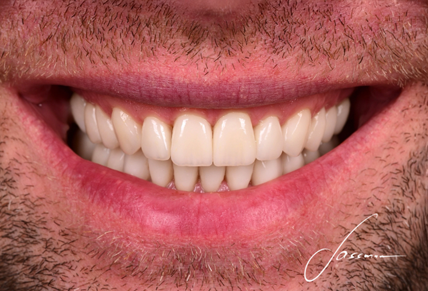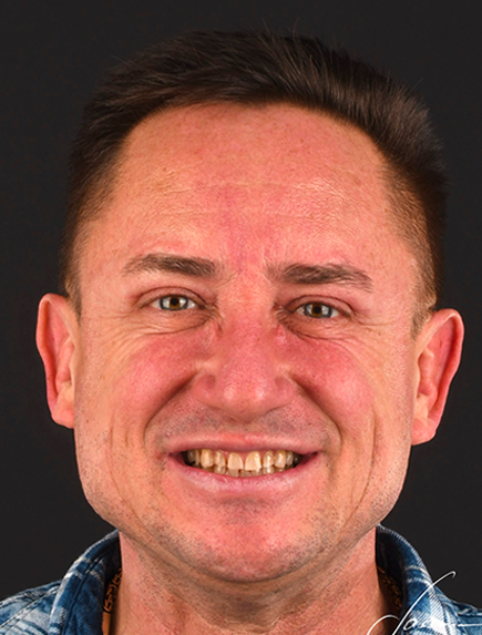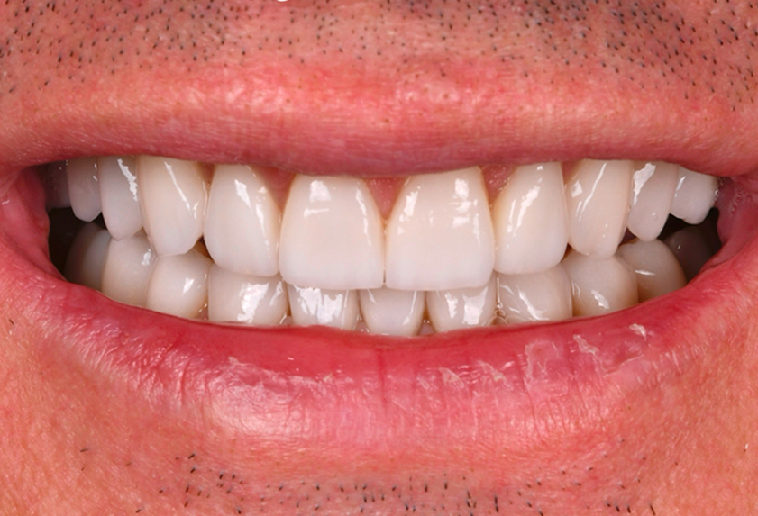 Celem leczenia u naszego pacjenta była zmiana koloru i kształtu startych zębów wraz z uzupełnieniem braków. Wykonano odbudowę kości z wszczepieniem implantów oraz pełną rekonstrukcję zgryzu za pomocą licówek, koron pełnoceramicznych oraz koron na implantach.